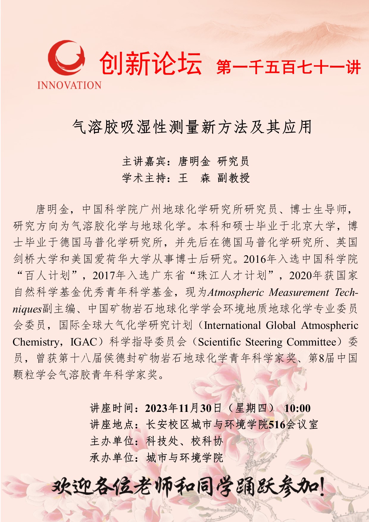 唐明金 研究员 必赢3003no1线路检测中心创新论坛第一千五百七十一讲:气溶胶吸湿性测量新方法及其应用 讲座时间 2023年11月30日(星期四) 10:00 讲座地点 长安校区城市与环境学院516会议室 讲座人介绍 唐明金 研究员 讲座内容