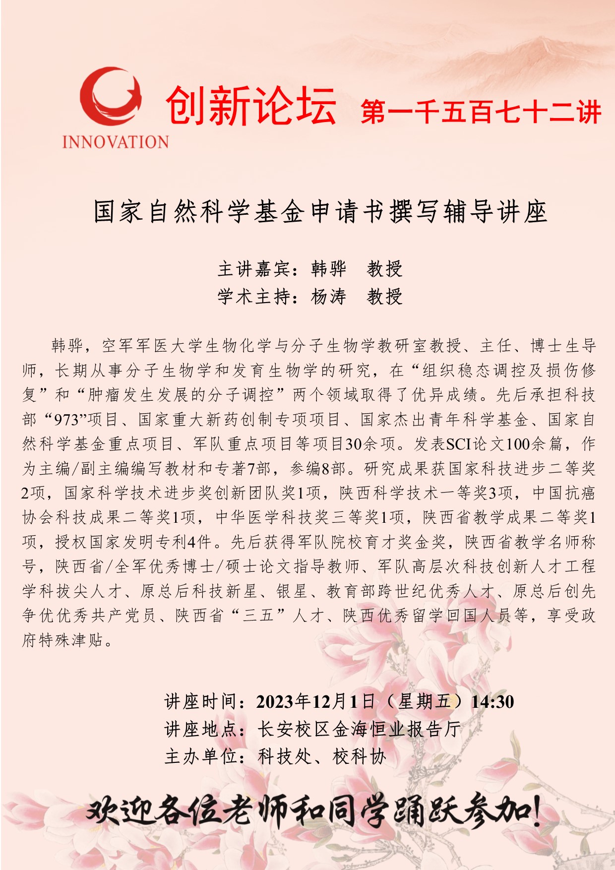 韩骅 教授 必赢3003no1线路检测中心创新论坛第一千五百七十二讲:国家自然科学基金申请书撰写辅导讲座 讲座时间 2023年12月1日(星期五)14:30 讲座地点 长安校区金海恒业报告厅 讲座人介绍 韩骅 教授 讲座内容