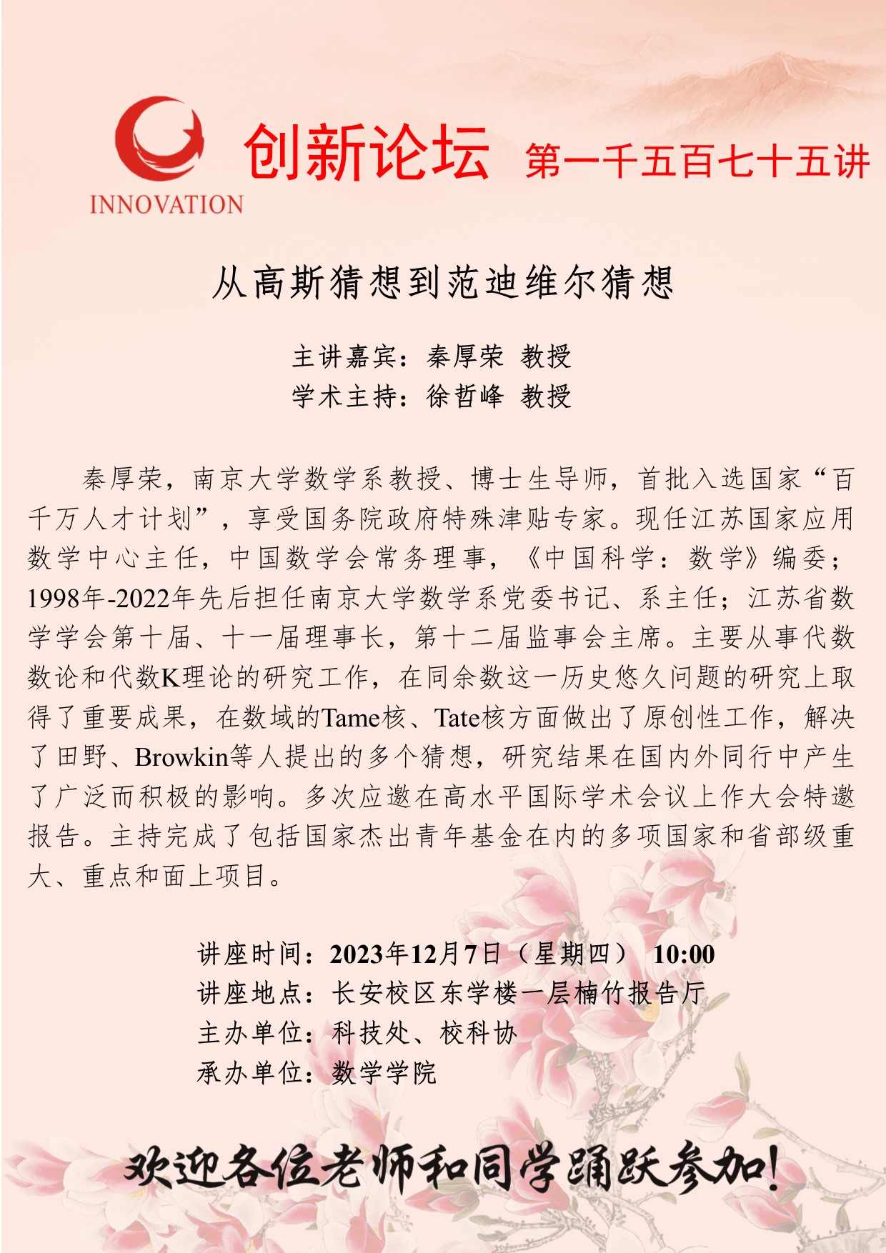 秦厚荣 教授 必赢3003no1线路检测中心创新论坛第一千五百七十五讲:从高斯猜想到范迪维尔猜想 讲座时间 2023年12月7日(星期四) 10:00 讲座地点 长安校区东学楼一层楠竹报告厅 讲座人介绍 秦厚荣 教授 讲座内容