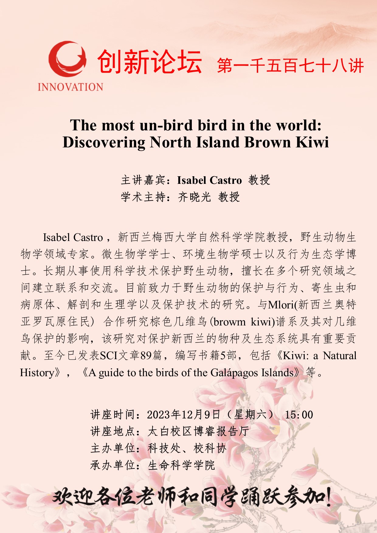 Isabel Castro 教授 必赢3003no1线路检测中心创新论坛第一千五百七十八讲:The most un-bird bird in the world: Discovering North Island Brown Kiwi 讲座时间 2023年12月9日(星期六) 15:00 讲座地点 太白校区博睿报告厅 讲座人介绍 Isabel Castro 教授 讲座内容