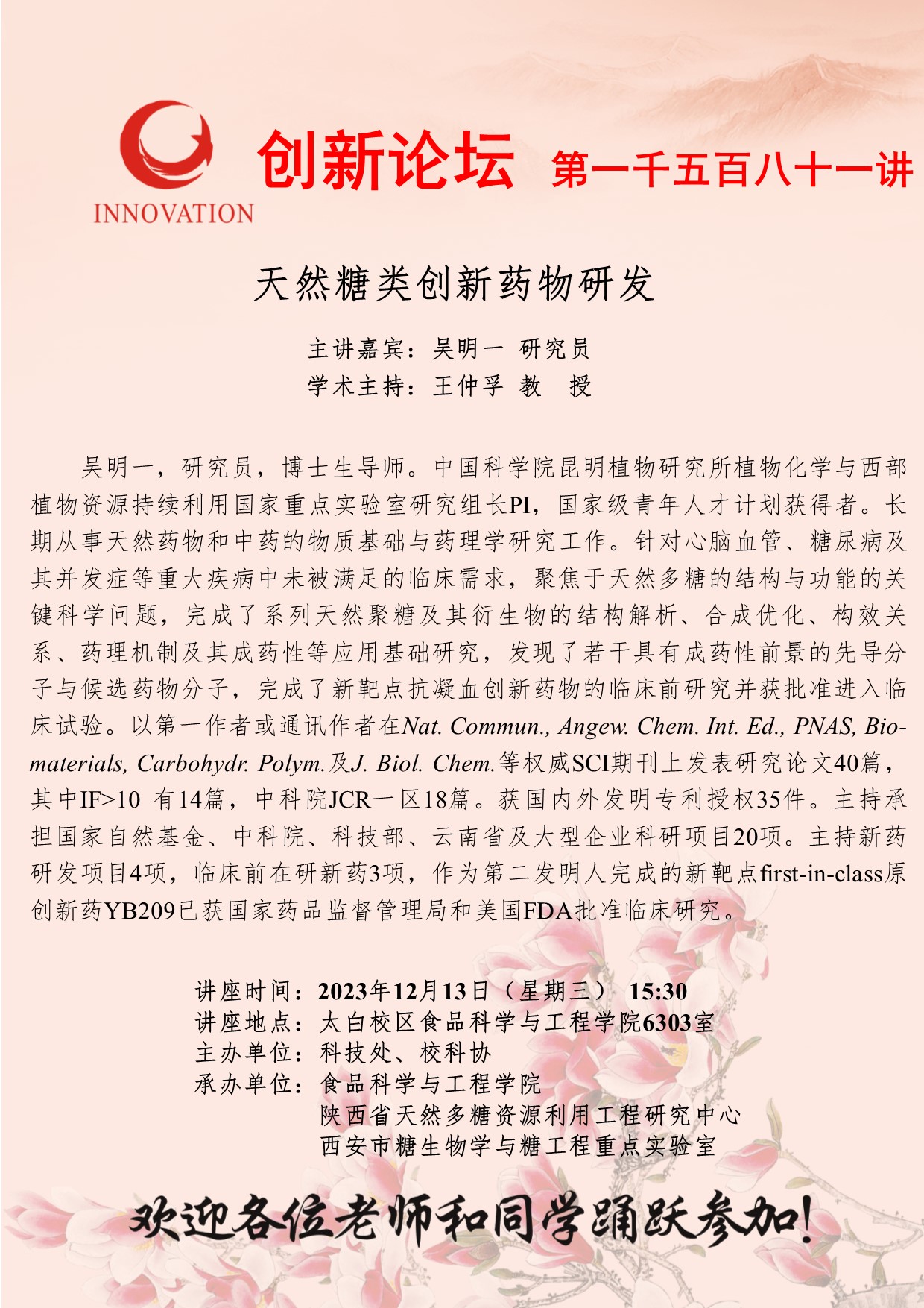 吴明一 研究员 必赢3003no1线路检测中心创新论坛第一千五百八十一讲:天然糖类创新药物研发 讲座时间 2023年12月13日(星期三) 15:30 讲座地点 太白校区食品科学与工程学院6303室 讲座人介绍 吴明一 研究员 讲座内容