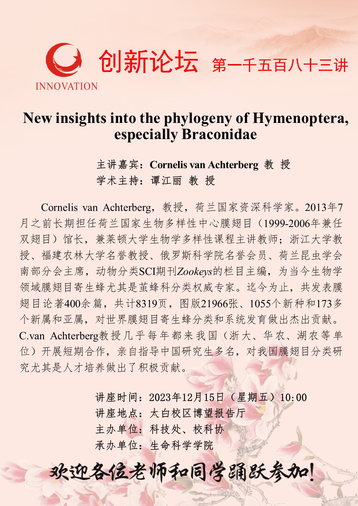 Cornelis van Achterberg 教 授 必赢3003no1线路检测中心创新论坛第一千五百八十三讲:New insights into the phylogeny of Hymenoptera, especially Braconidae 讲座时间 2023年12月15日(星期五)10:00 讲座地点 太白校区博望报告厅 讲座人介绍 Cornelis van Achterberg 教 授 讲座内容