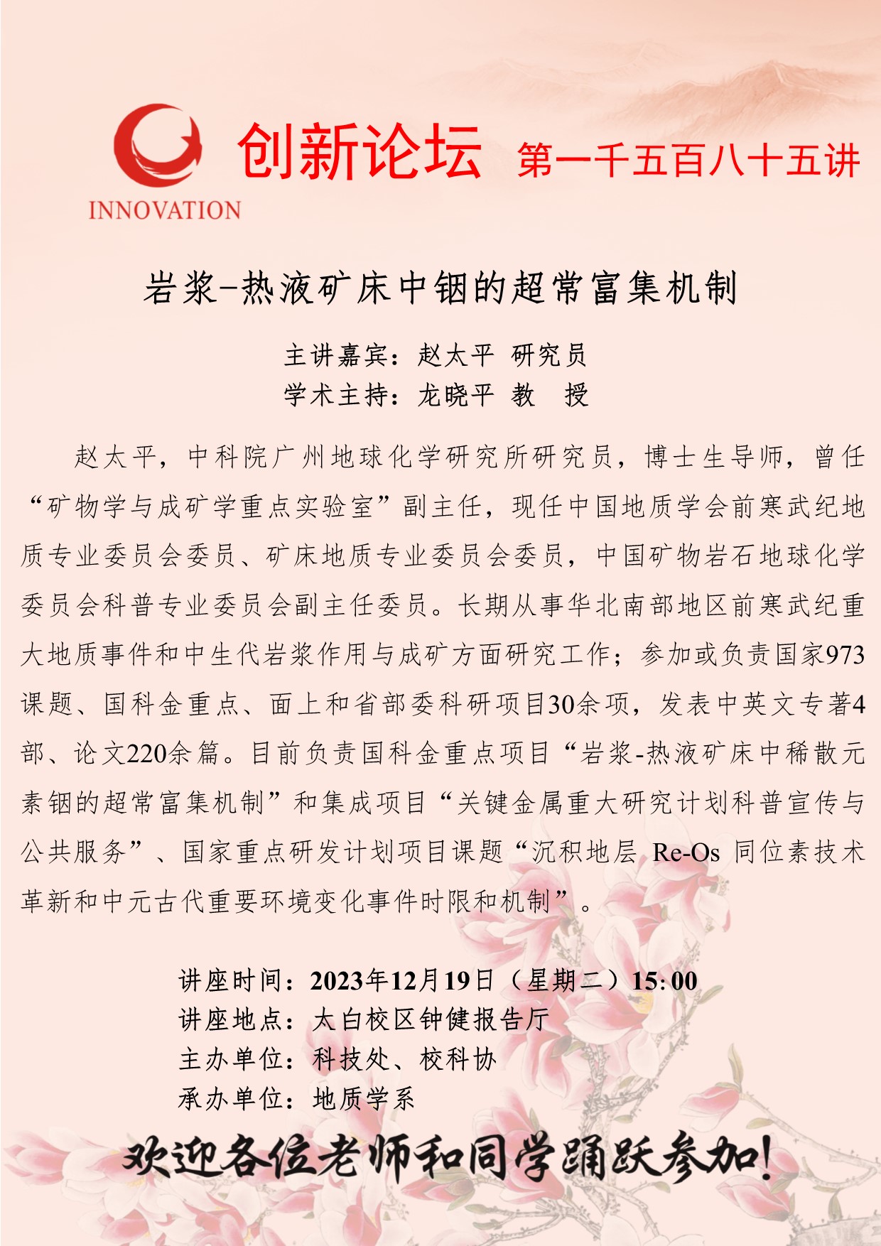 赵太平 研究员 必赢3003no1线路检测中心创新论坛第一千五百八十五讲:岩浆-热液矿床中铟的超常富集机制 讲座时间 2023年12月19日(星期二)15:00 讲座地点 太白校区钟健报告厅 讲座人介绍 赵太平 研究员 讲座内容