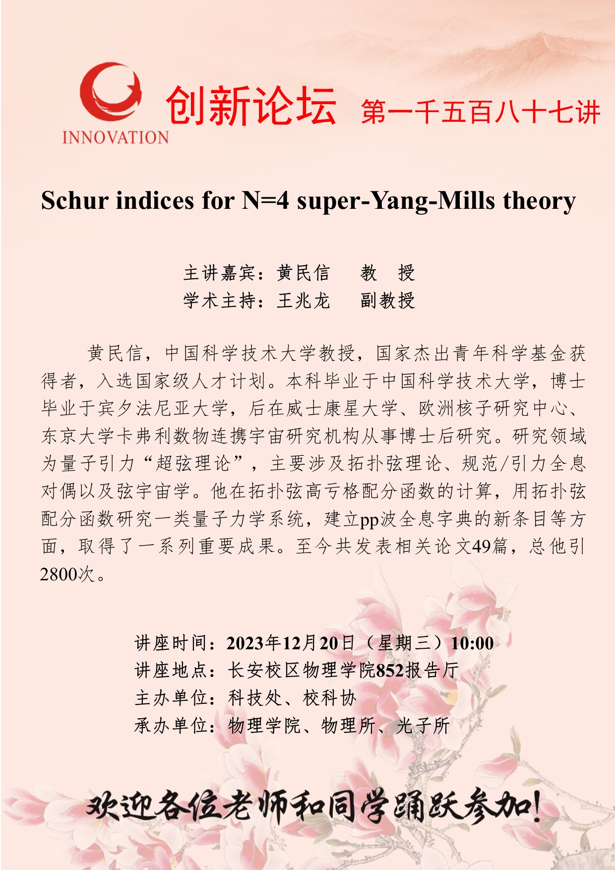 黄民信 教 授 必赢3003no1线路检测中心创新论坛第一千五百八十七讲:Schur indices for N=4 super-Yang-Mills theory 讲座时间 2023年12月20日(星期三)10:00 讲座地点 长安校区物理学院852报告厅 讲座人介绍 黄民信 教 授 讲座内容