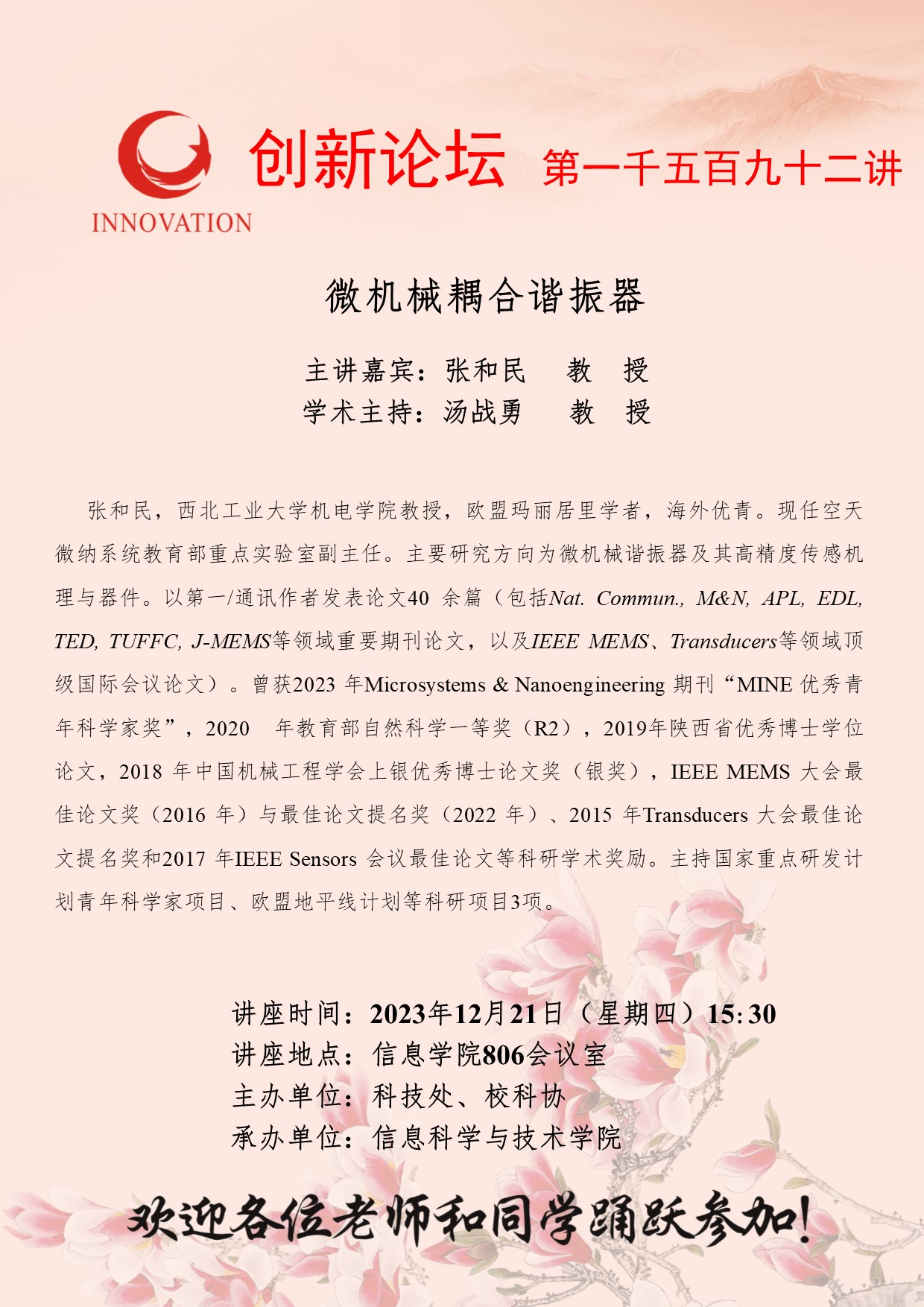 张和民 教授 必赢3003no1线路检测中心创新论坛第一千五百九十二讲:微机械耦合谐振器 讲座时间 2023年12月21日(星期四)15:30 讲座地点 信息学院806会议室 讲座人介绍 张和民 教授 讲座内容