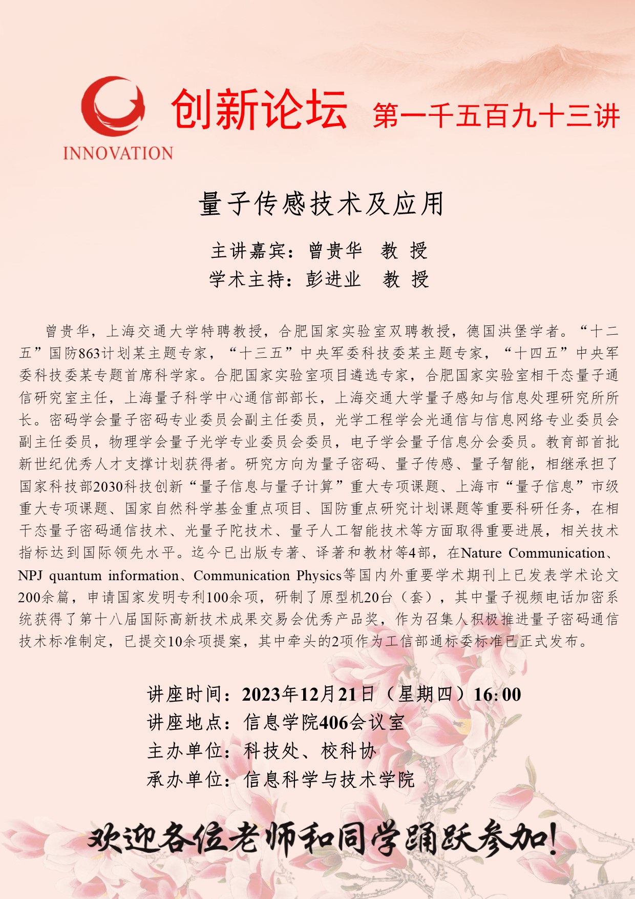 曾贵华 教授 必赢3003no1线路检测中心创新论坛第一千五百九十三讲:量子传感技术及应用 讲座时间 2023年12月21日(星期四)16:00 讲座地点 信息学院406会议室 讲座人介绍 曾贵华 教授 讲座内容