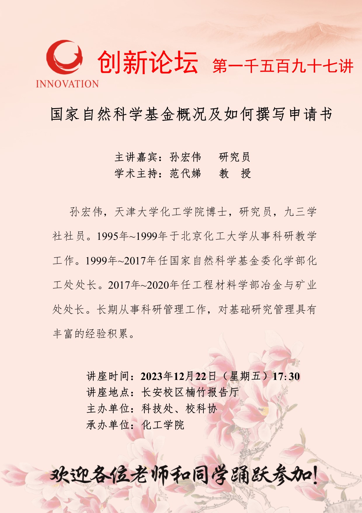孙宏伟 研究员 必赢3003no1线路检测中心创新论坛第一千五百九十七讲:国家自然科学基金概况及如何撰写申请书 讲座时间 2023年12月22日(星期五)17:30 讲座地点 长安校区楠竹报告厅 讲座人介绍 孙宏伟 研究员 讲座内容