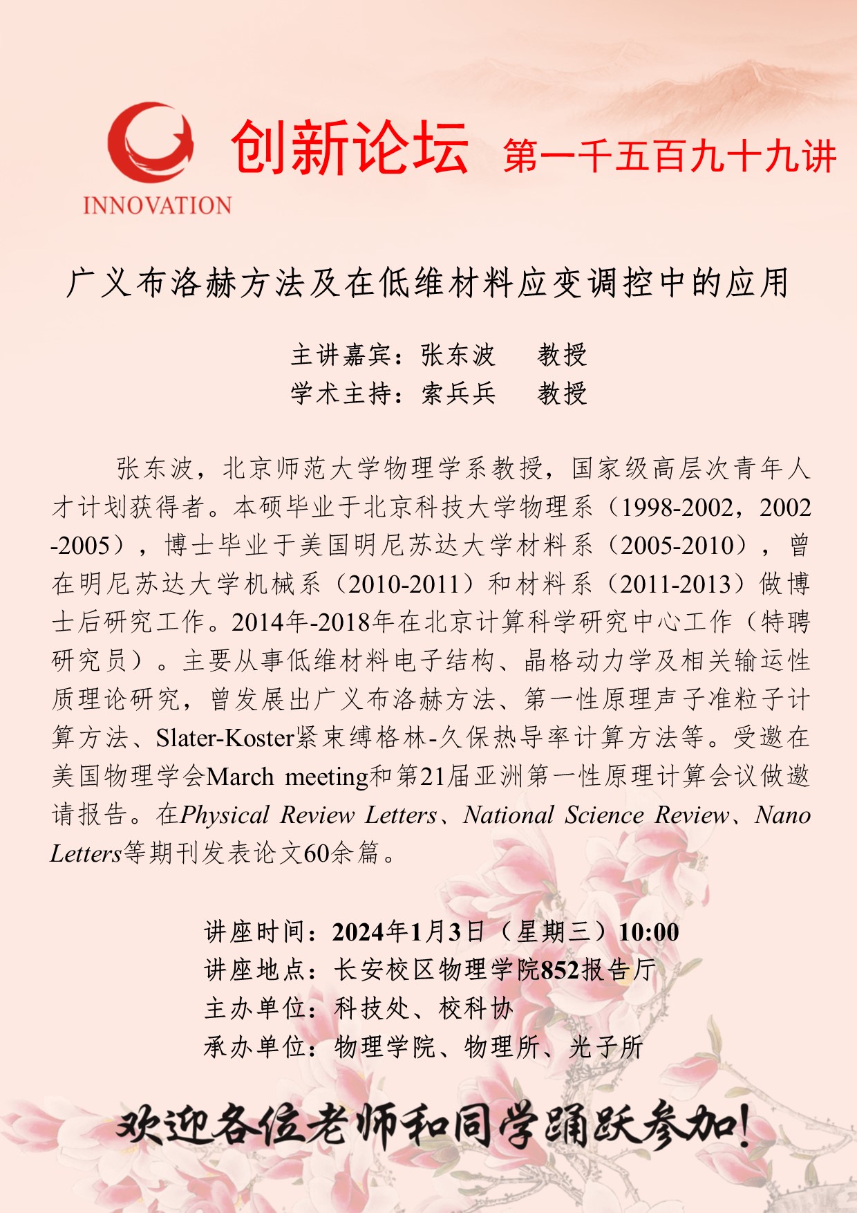 张东波 教授 必赢3003no1线路检测中心创新论坛第一千五百九十九讲:广义布洛赫方法及在低维材料应变调控中的应用 讲座时间 2024年1月3日(星期三)10:00 讲座地点 长安校区物理学院852报告厅 讲座人介绍 张东波 教授 讲座内容