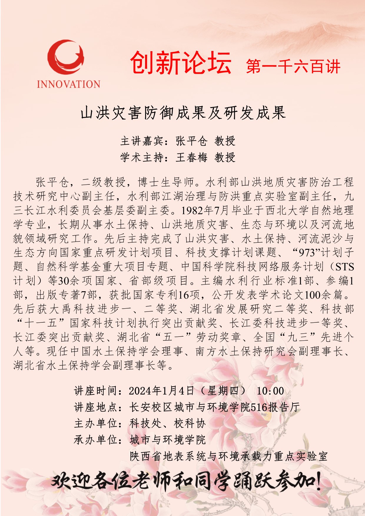 张平仓 教授 必赢3003no1线路检测中心创新论坛第一千六百讲:山洪灾害防御成果及研发成果 讲座时间 2024年1月4日(星期四) 10:00 讲座地点 长安校区城市与环境学院516报告厅 讲座人介绍 张平仓 教授 讲座内容