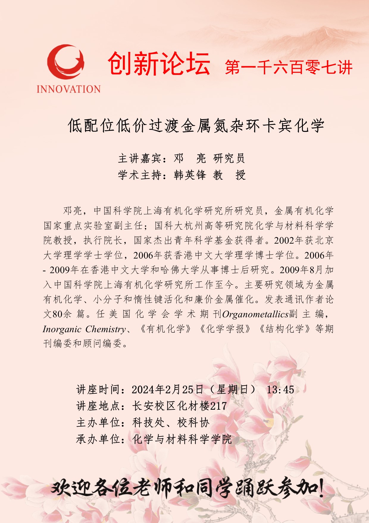 邓亮 研究员 必赢3003no1线路检测中心创新论坛第一千六百零七讲: 低配位低价过渡金属氮杂环卡宾化学 讲座时间 2024年2月25日(星期日) 13:45 讲座地点 长安校区化材楼217 讲座人介绍 邓亮 研究员 讲座内容