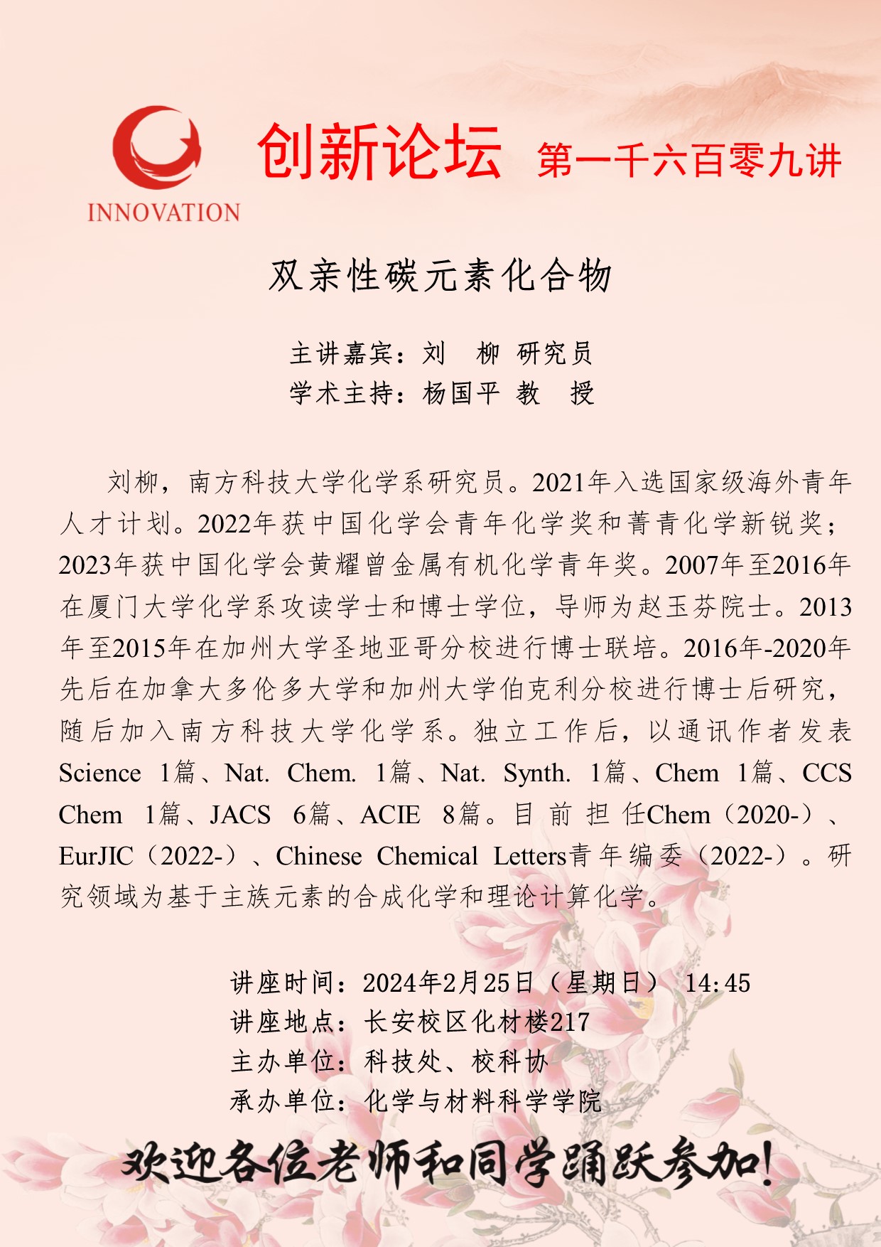 刘柳 研究员 必赢3003no1线路检测中心创新论坛第一千六百零九讲:双亲性碳元素化合物 讲座时间 2024年2月25日(星期日) 14:45 讲座地点 长安校区化材楼217 讲座人介绍 刘柳 研究员 讲座内容