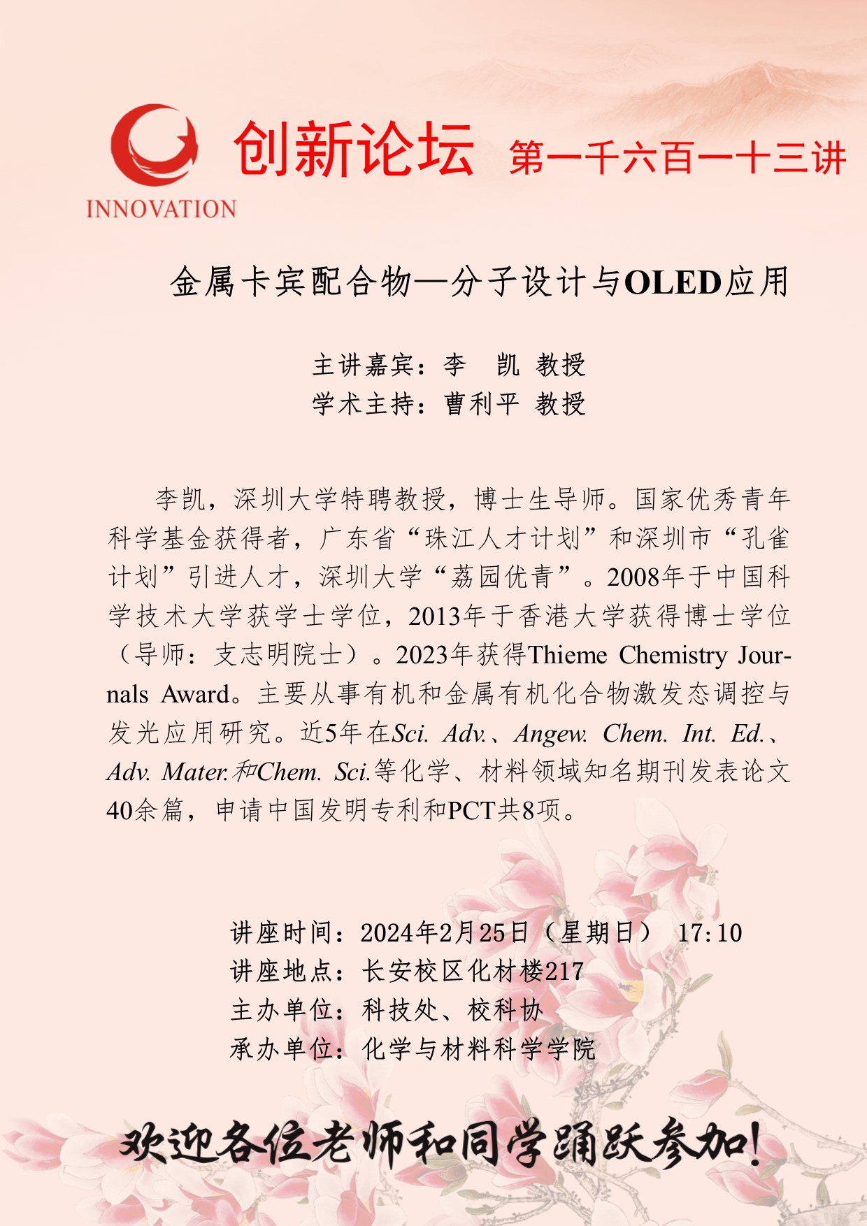李凯 教授 必赢3003no1线路检测中心创新论坛第一千六百一十三讲:金属卡宾配合物—分子设计与OLED应用 讲座时间 2024年2月25日(星期日) 17:10 讲座地点 长安校区化材楼217 讲座人介绍 李凯 教授 讲座内容