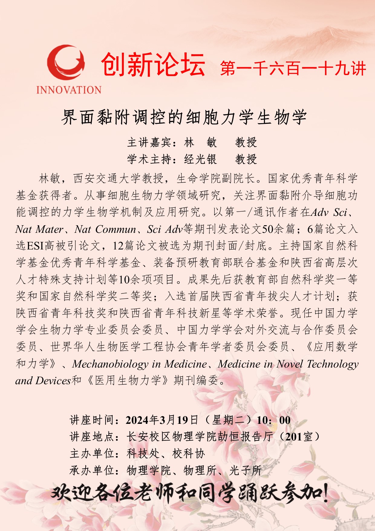 林敏 教授 必赢3003no1线路检测中心创新论坛第一千六百一十九讲:界面黏附调控的细胞力学生物学 讲座时间 2024年3月19日(星期二)10:00 讲座地点 长安校区物理学院劼恒报告厅(201室) 讲座人介绍 林敏 教授 讲座内容