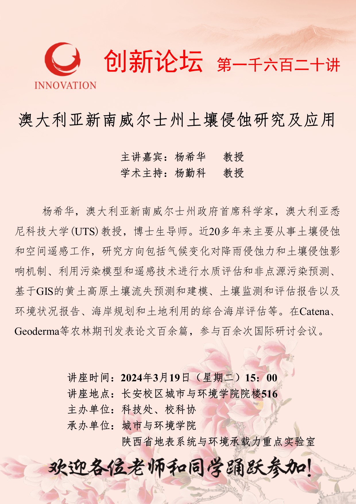 杨希华 教授 必赢3003no1线路检测中心创新论坛第一千六百二十讲:澳大利亚新南威尔士州土壤侵蚀研究及应用 讲座时间 2024年3月19日(星期二)15:00 讲座地点 长安校区城市与环境学院院楼516 讲座人介绍 杨希华 教授 讲座内容