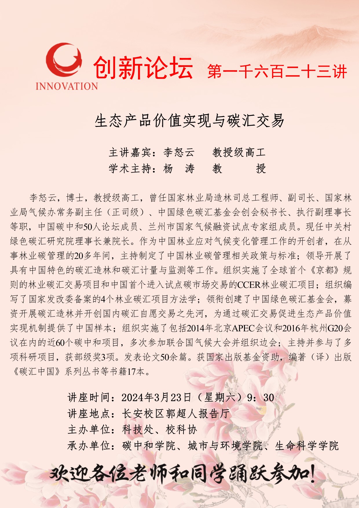 李怒云 教授级高工 必赢3003no1线路检测中心创新论坛第一千六百二十三讲:生态产品价值实现与碳汇交易 讲座时间 2024年3月23日(星期六)9:30 讲座地点 长安校区郭超人报告厅 讲座人介绍 李怒云 教授级高工 讲座内容