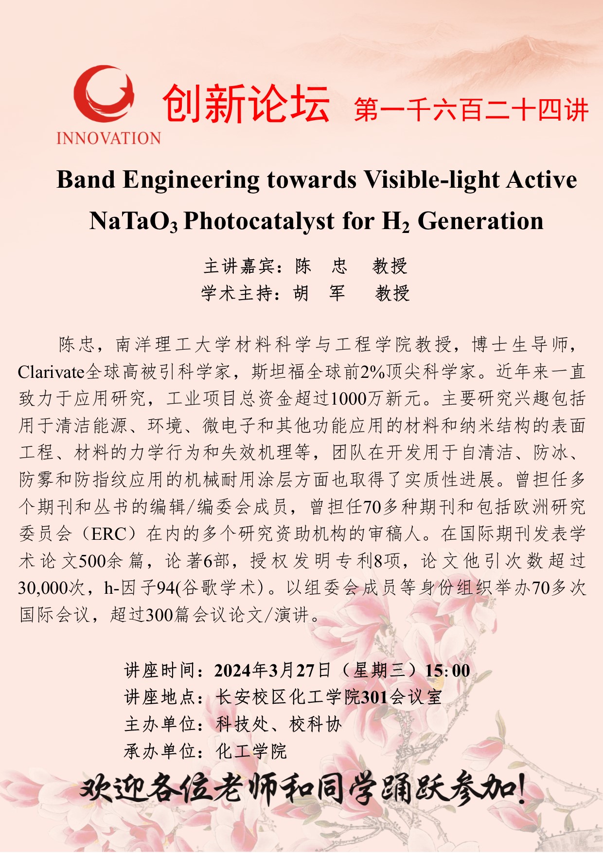 陈忠 教授 必赢3003no1线路检测中心创新论坛第一千六百二十四讲:Band Engineering towards Visible-light Active NaTaO3 Photocatalyst for H2 Generation 讲座时间 2024年3月27日(星期三)15:00 讲座地点 长安校区化工学院301会议室 讲座人介绍 陈忠 教授 讲座内容
