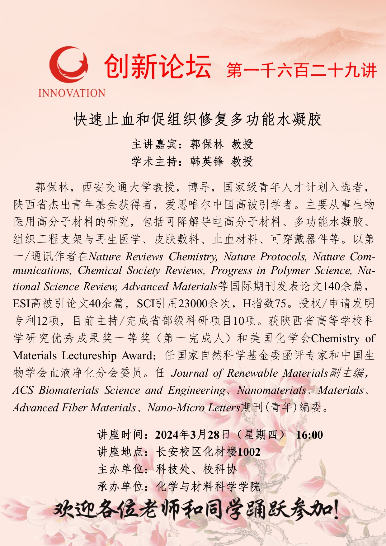 郭保林 教授 必赢3003no1线路检测中心创新论坛第一千六百二十九讲:快速止血和促组织修复多功能水凝胶 讲座时间 2024年3月28日(星期四) 16:00 讲座地点 长安校区化材楼1002 讲座人介绍 郭保林 教授 讲座内容