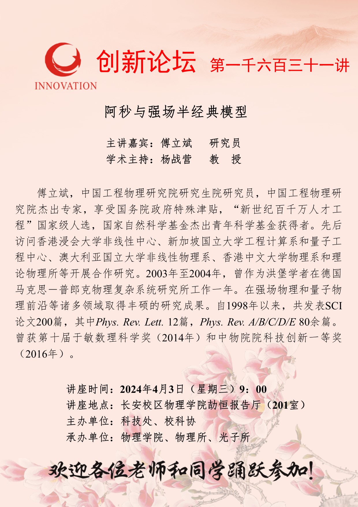 傅立斌 研究员 必赢3003no1线路检测中心创新论坛第一千六百三十一讲:阿秒与强场半经典模型 讲座时间 2024年4月3日(星期三)9:00 讲座地点 长安校区物理学院劼恒报告厅(201室) 讲座人介绍 傅立斌 研究员 讲座内容