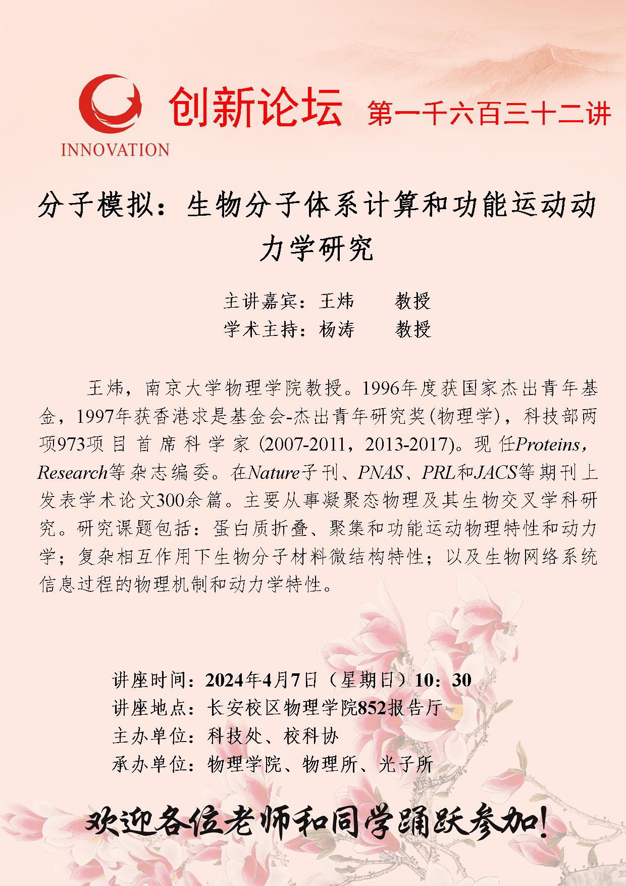 王炜 教授 必赢3003no1线路检测中心创新论坛第一千六百三十二讲:分子模拟:生物分子体系计算和功能运动动力学研究 讲座时间 2024年4月7日(星期日)10:30 讲座地点 长安校区物理学院852报告厅 讲座人介绍 王炜 教授 讲座内容