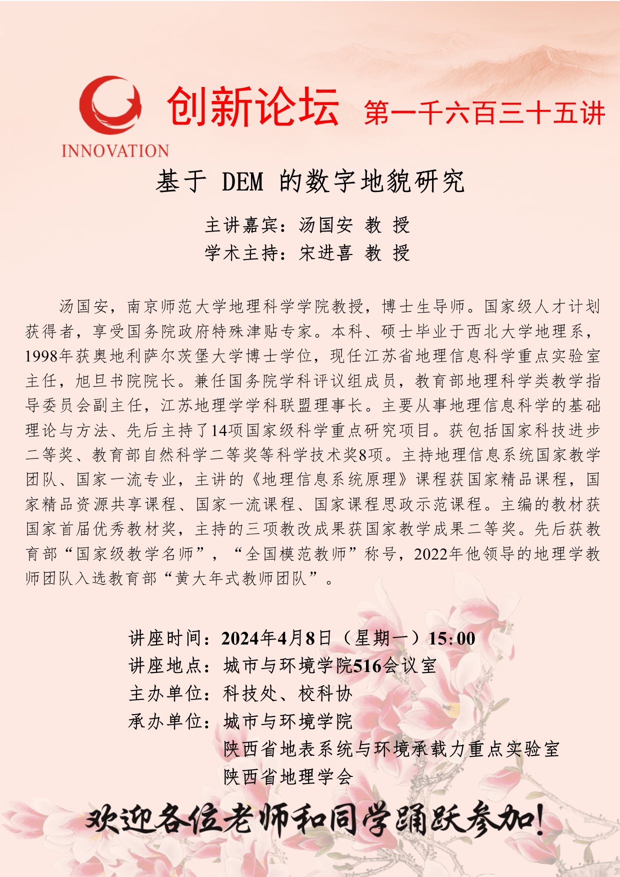 汤国安 教授 必赢3003no1线路检测中心创新论坛第一千六百三十五讲:基于 DEM 的数字地貌研究 讲座时间 2024年4月8日(星期一)15:00 讲座地点 城市与环境学院516会议室 讲座人介绍 汤国安 教授 讲座内容