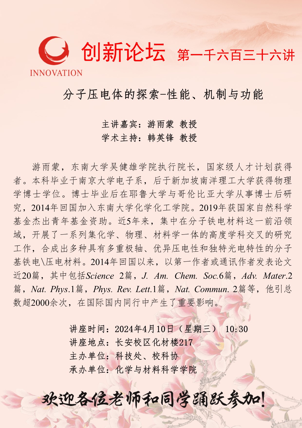 游雨蒙 教授 必赢3003no1线路检测中心创新论坛第一千六百三十六讲:分子压电体的探索-性能、机制与功能 讲座时间 2024年4月10日(星期三) 10:30 讲座地点 长安校区化材楼217 讲座人介绍 游雨蒙 教授 讲座内容