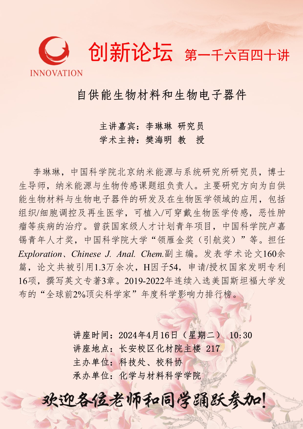 李琳琳 研究员 必赢3003no1线路检测中心创新论坛第一千六百四十讲:自供能生物材料和生物电子器件 讲座时间 2024年4月16日(星期二) 10:30 讲座地点 长安校区化材院主楼 217 讲座人介绍 李琳琳 研究员 讲座内容
