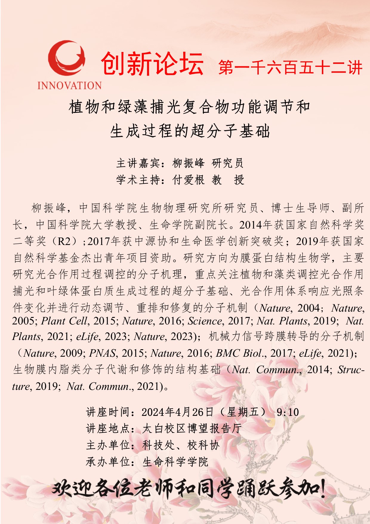 柳振峰 研究员 必赢3003no1线路检测中心创新论坛第一千六百五十二讲:植物和绿藻捕光复合物功能调节和生成过程的超分子基础 讲座时间 2024年4月26日(星期五) 9:10 讲座地点 太白校区博望报告厅 讲座人介绍 柳振峰 研究员 讲座内容