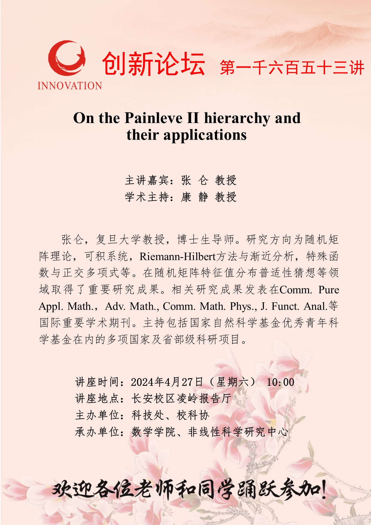 张仑 教授 必赢3003no1线路检测中心创新论坛第一千六百五十三讲:On the Painleve II hierarchy and their applications 讲座时间 2024年4月27日(星期六) 10:00 讲座地点 长安校区凌岭报告厅 讲座人介绍 张仑 教授 讲座内容