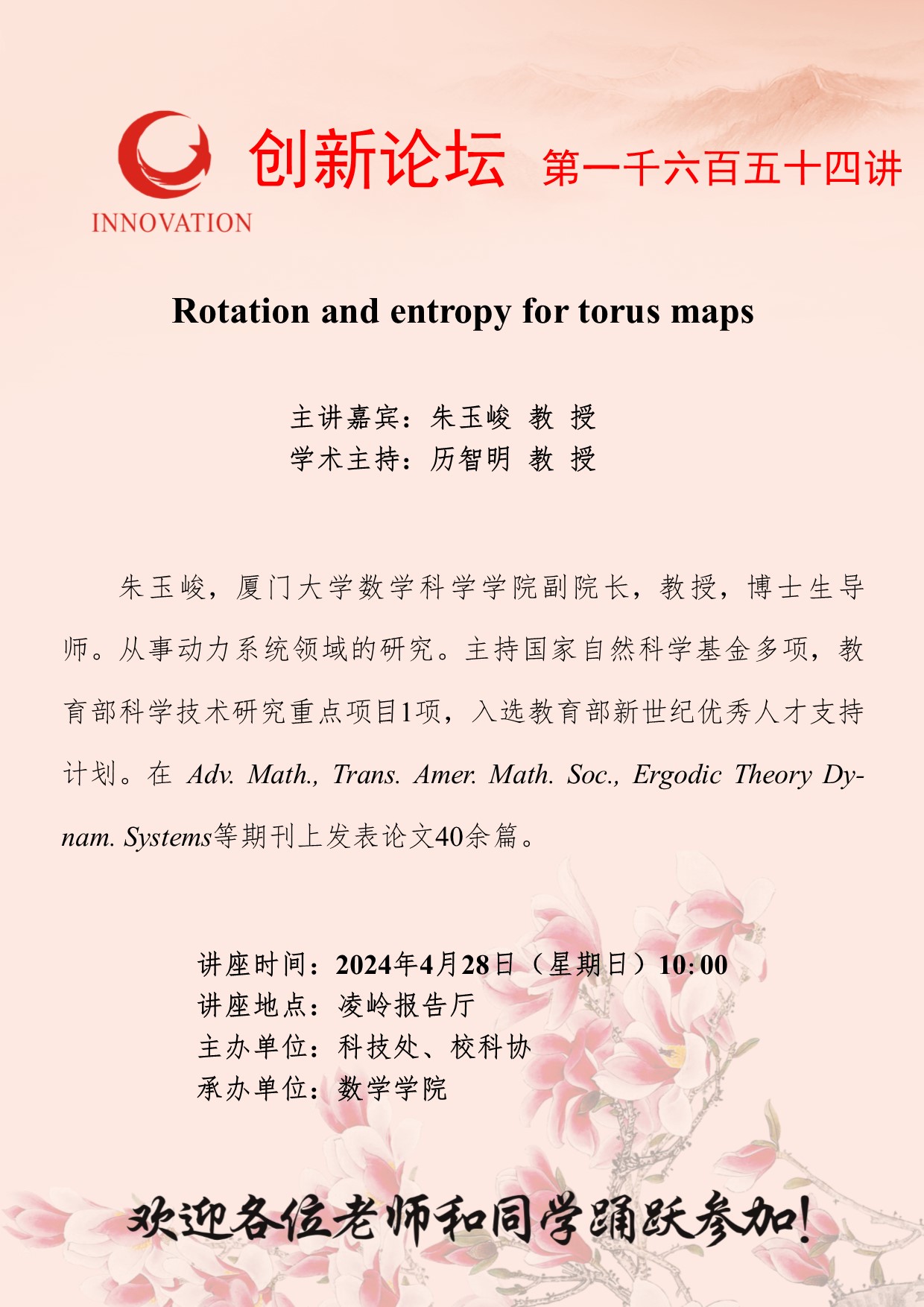 朱玉峻 教授 必赢3003no1线路检测中心创新论坛第一千六百五十四讲:Rotation and entropy for torus maps 讲座时间 2024年4月28日(星期日)10:00 讲座地点 凌岭报告厅 讲座人介绍 朱玉峻 教授 讲座内容