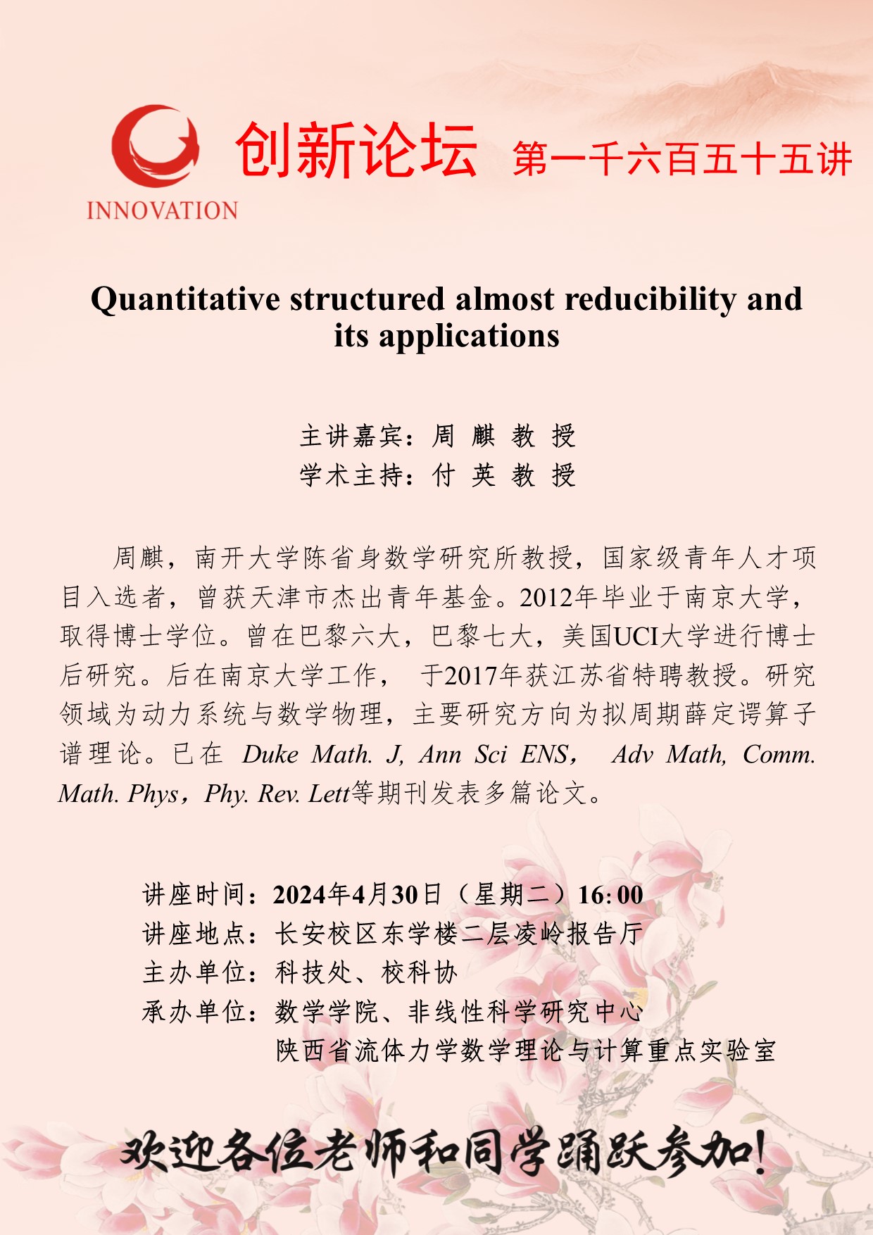 周 麒 教 授 必赢3003no1线路检测中心创新论坛第一千六百五十五讲:Quantitative structured almost reducibility and its applications 讲座时间 2024年4月30日(星期二)16:00 讲座地点 长安校区东学楼二层凌岭报告厅 讲座人介绍 周 麒 教 授 讲座内容