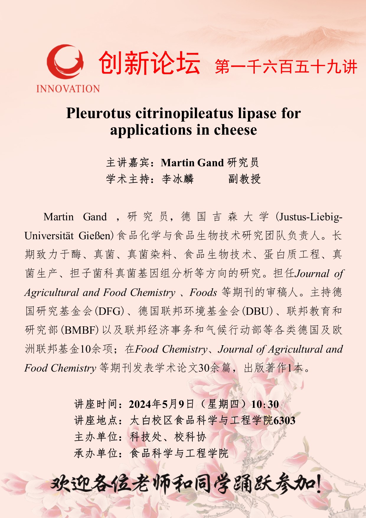 Martin Gand 研究员 必赢3003no1线路检测中心创新论坛第一千六百五十九讲:Pleurotus citrinopileatus lipase for applications in cheese 讲座时间 2024年5月9日(星期四)10:30 讲座地点 太白校区食品科学与工程学院6303 讲座人介绍 Martin Gand 研究员 讲座内容