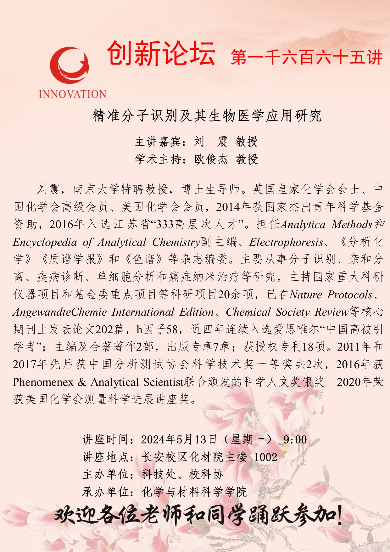 刘 震 教授 必赢3003no1线路检测中心创新论坛第一千六百六十五讲:精准分子识别及其生物医学应用研究 讲座时间 2024年5月13日(星期一) 9:00 讲座地点 长安校区化材院主楼 1002 室 讲座人介绍 刘 震 教授 讲座内容