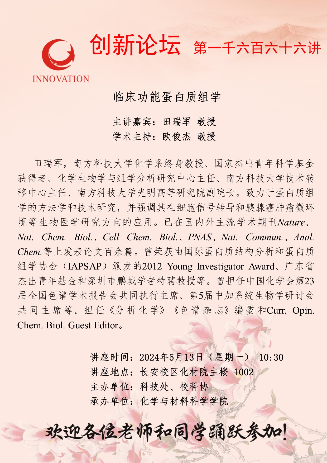 田瑞军 教授 必赢3003no1线路检测中心创新论坛第一千六百六十六讲:临床功能蛋白质组学 讲座时间 2024年5月13日(星期一) 10:30 讲座地点 长安校区化材院主楼 1002 讲座人介绍 田瑞军 教授 讲座内容