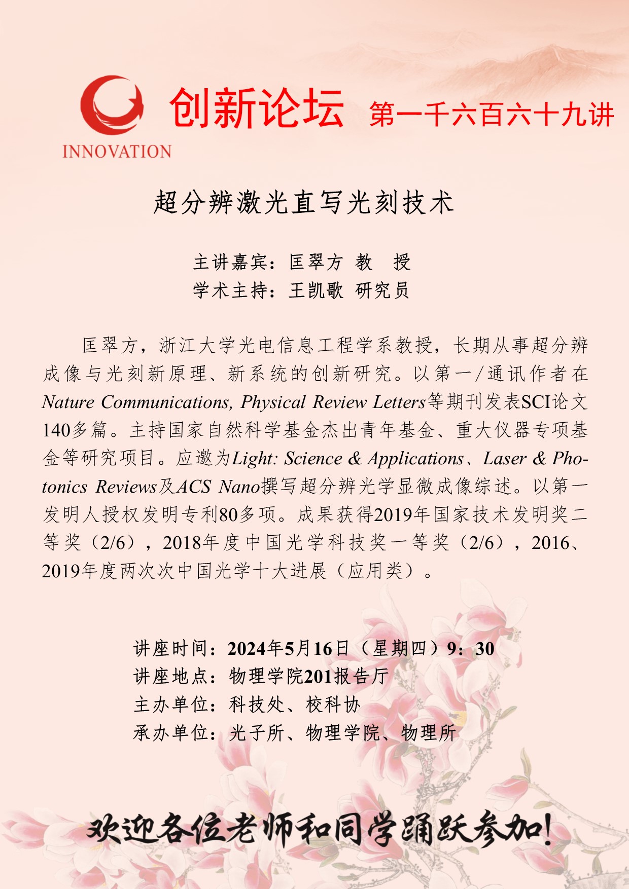 匡翠方 教 授 必赢3003no1线路检测中心创新论坛第一千六百六十九讲:超分辨激光直写光刻技术 讲座时间 2024年5月16日(星期四)9:30 讲座地点 物理学院201报告厅 讲座人介绍 匡翠方 教 授 讲座内容