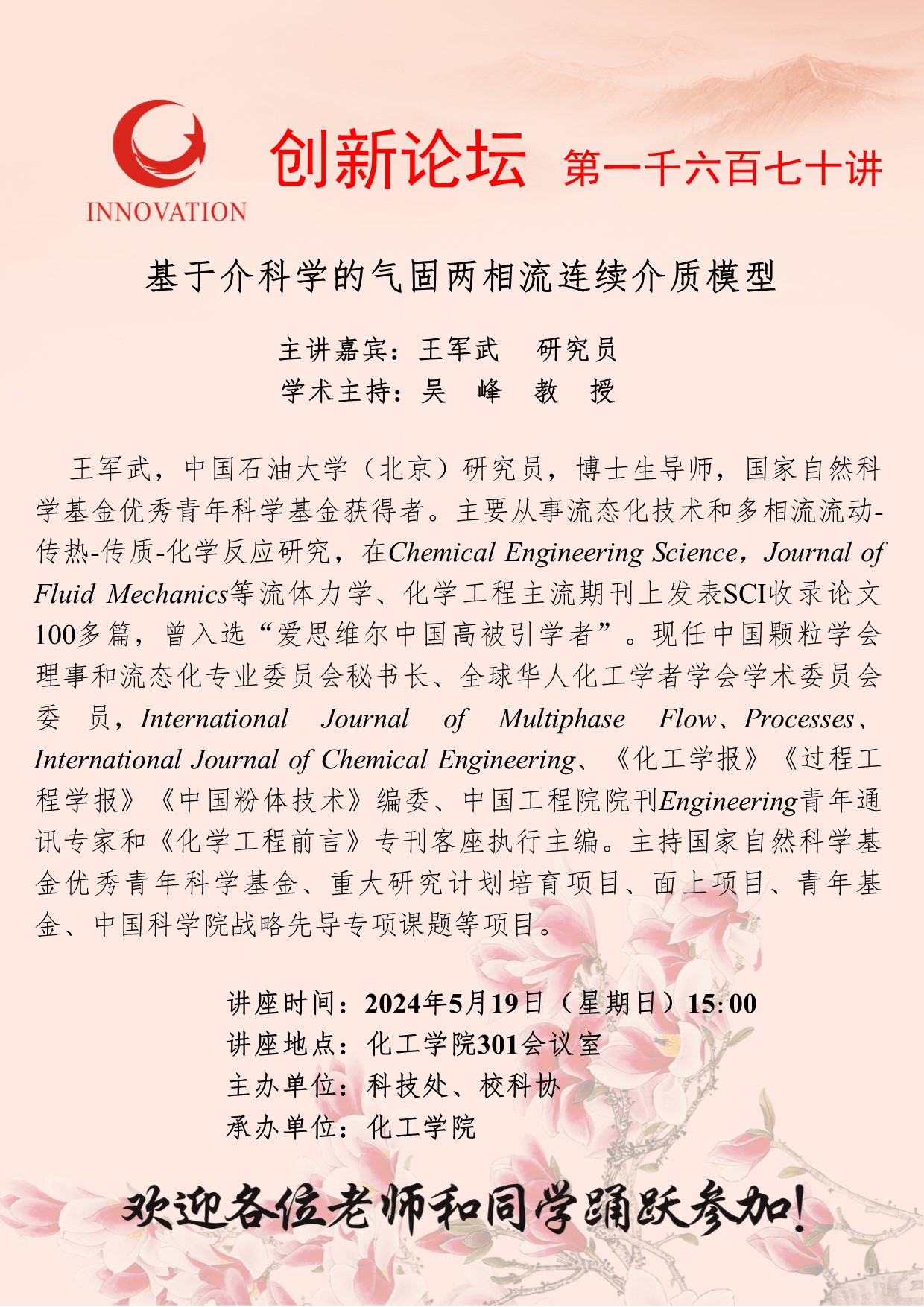 王军武 研究员 必赢3003no1线路检测中心创新论坛第一千六百七十讲:基于介科学的气固两相流连续介质模型 讲座时间 2024年5月19日(星期日)15:00 讲座地点 化工学院301会议室 讲座人介绍 王军武 研究员 讲座内容