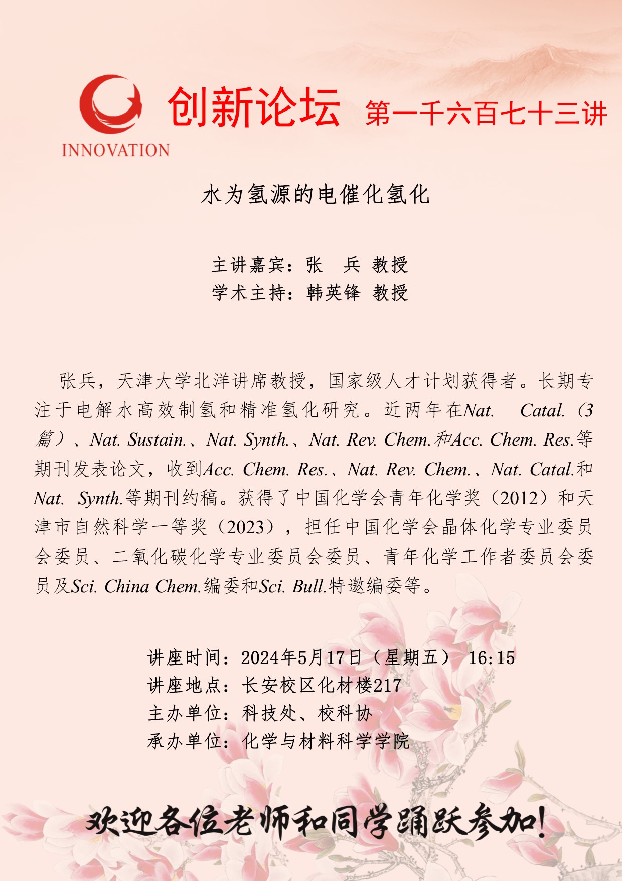 张兵 教授 必赢3003no1线路检测中心创新论坛第一千六百七十三讲:水为氢源的电催化氢化 讲座时间 2024年5月17日(星期五) 16:15 讲座地点 长安校区化材楼217 讲座人介绍 张兵 教授 讲座内容
