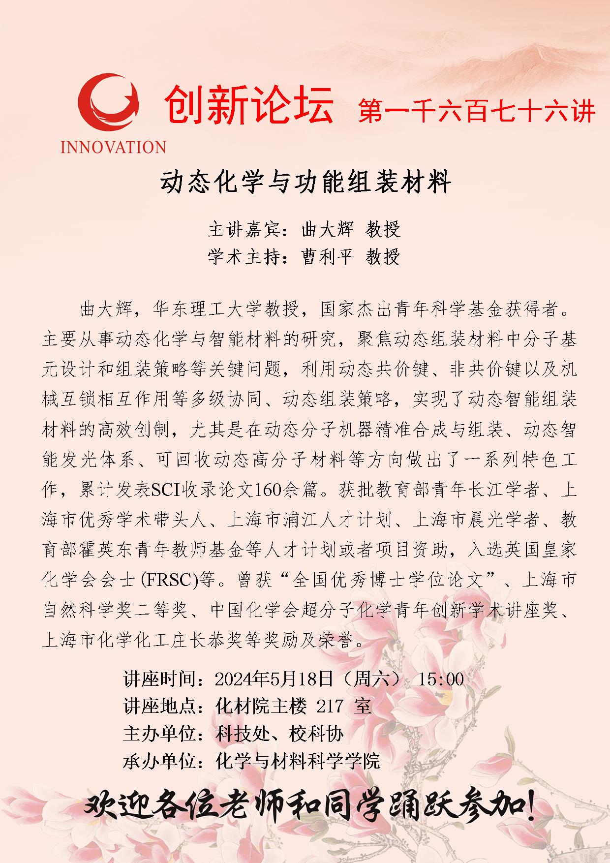 曲大辉 教授 必赢3003no1线路检测中心创新论坛第一千六百七十六讲:动态化学与功能组装材料 讲座时间 2024年5月18日(星期六) 15:00 讲座地点 长安校区化材主楼 217 室 讲座人介绍 曲大辉 教授 讲座内容