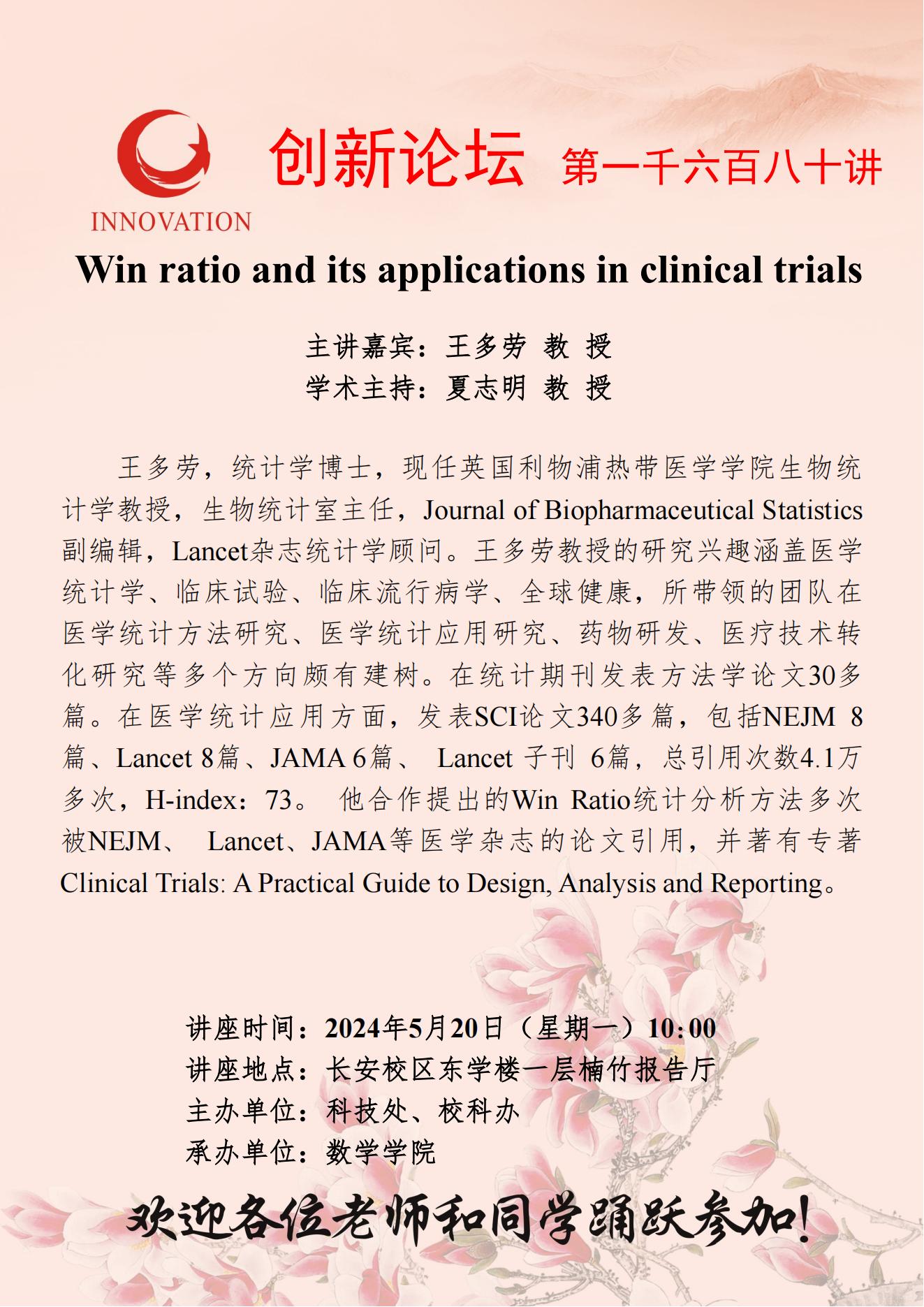 王多劳 教授 必赢3003no1线路检测中心创新论坛第一千六百八十讲:Win ratio and its applications in clinical trials 讲座时间 2024年5月20日(星期一) 10:00 讲座地点 长安校区东学楼一层楠竹报告厅 讲座人介绍 王多劳 教授 讲座内容