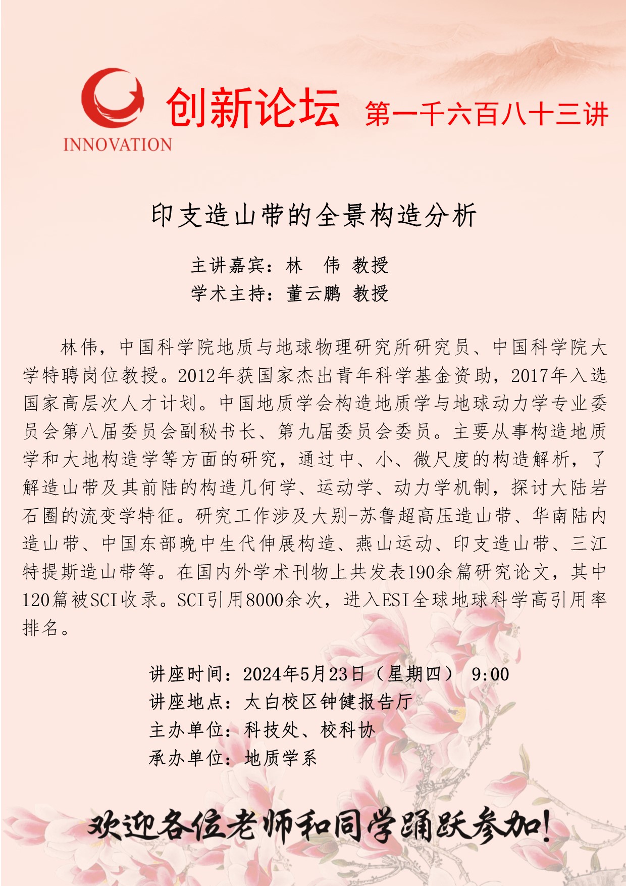 林 伟 教授 必赢3003no1线路检测中心创新论坛第一千六百八十三讲:印支造山带的全景构造分析 讲座时间 2024年5月23日(星期四) 9:00 讲座地点 太白校区钟健报告厅 讲座人介绍 林 伟 教授 讲座内容