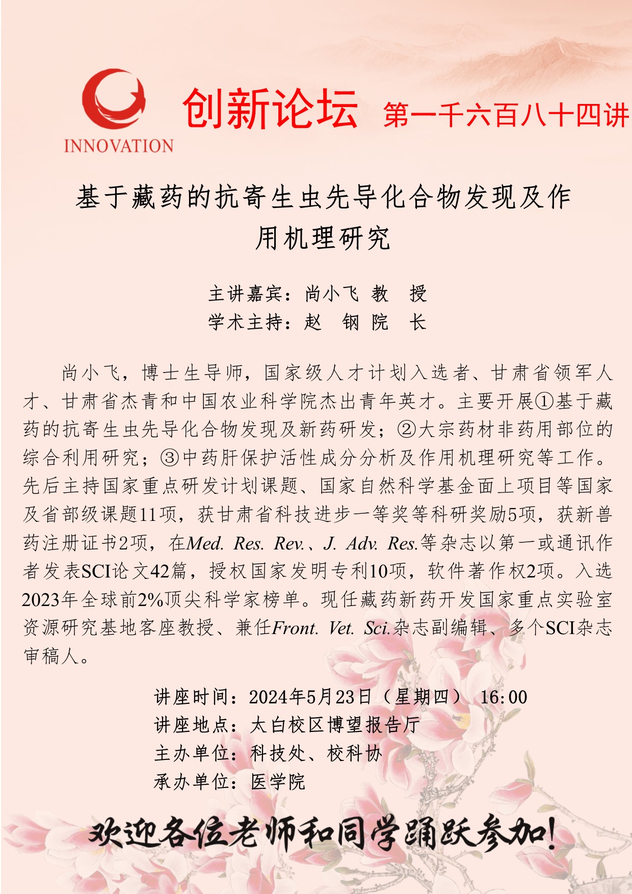 尚小飞 教授 必赢3003no1线路检测中心创新论坛第一千六百八十四讲:基于藏药的抗寄生虫先导化合物发现及作用机理研究 讲座时间 2024年5月23日(星期四) 16:00 讲座地点 太白校区博望报告厅 讲座人介绍 尚小飞 教授 讲座内容