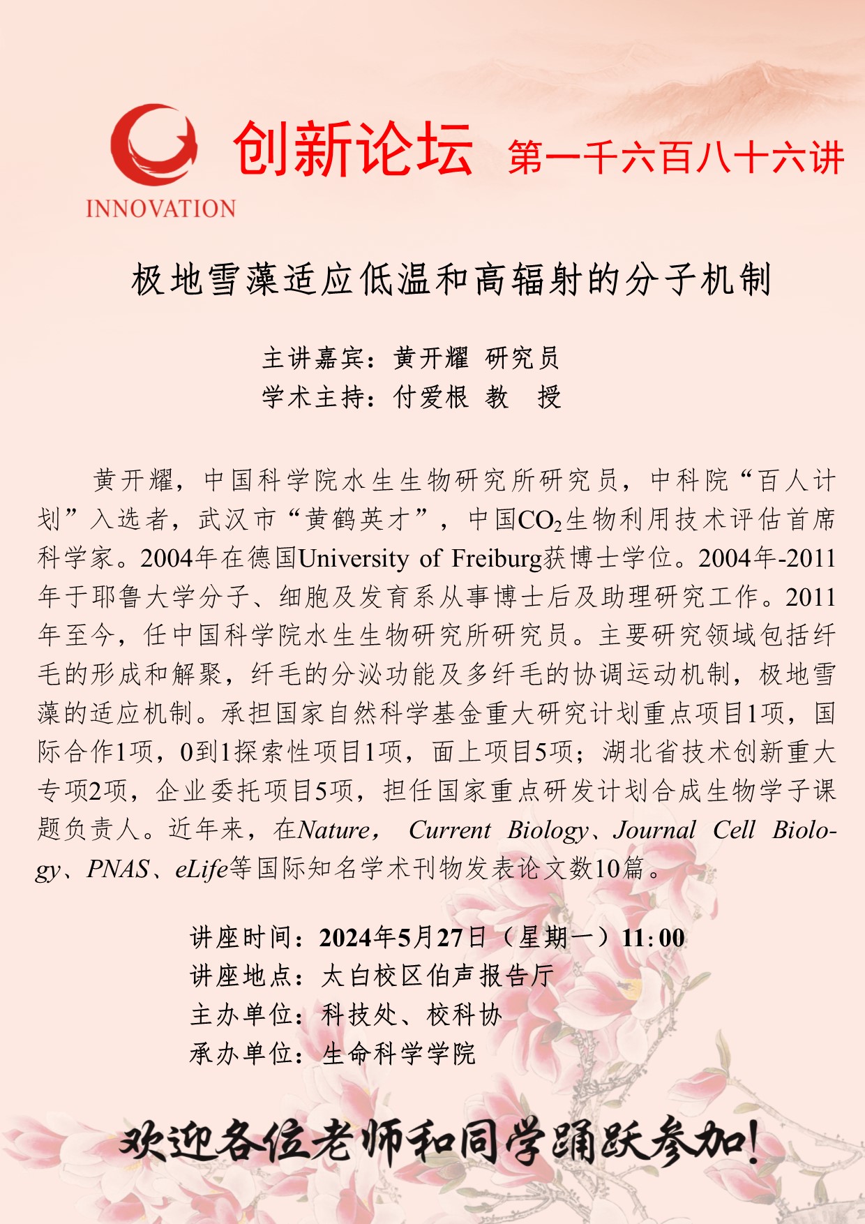 黄开耀 研究员 必赢3003no1线路检测中心创新论坛第一千六百八十六讲:极地雪藻适应低温和高辐射的分子机制 讲座时间 2024年5月27日(星期一)11:00 讲座地点 太白校区伯声报告厅 讲座人介绍 黄开耀 研究员 讲座内容