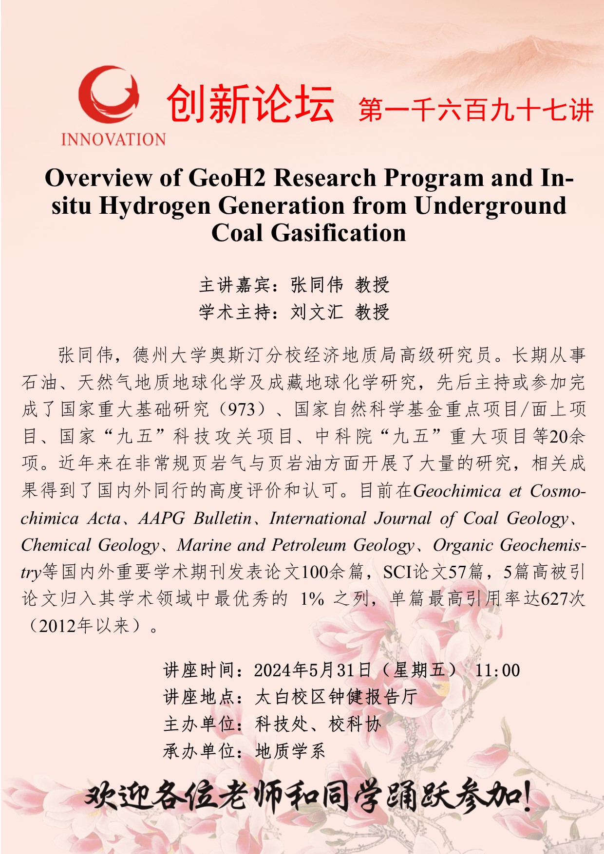 张同伟 教授 必赢3003no1线路检测中心创新论坛第一千六百九十七讲:Overview of GeoH2 Research Program and In-situ Hydrogen Generation from Underground Coal Gasification 讲座时间 2024年5月31日(星期五) 11:00 讲座地点 太白校区钟健报告厅 讲座人介绍 张同伟 教授 讲座内容