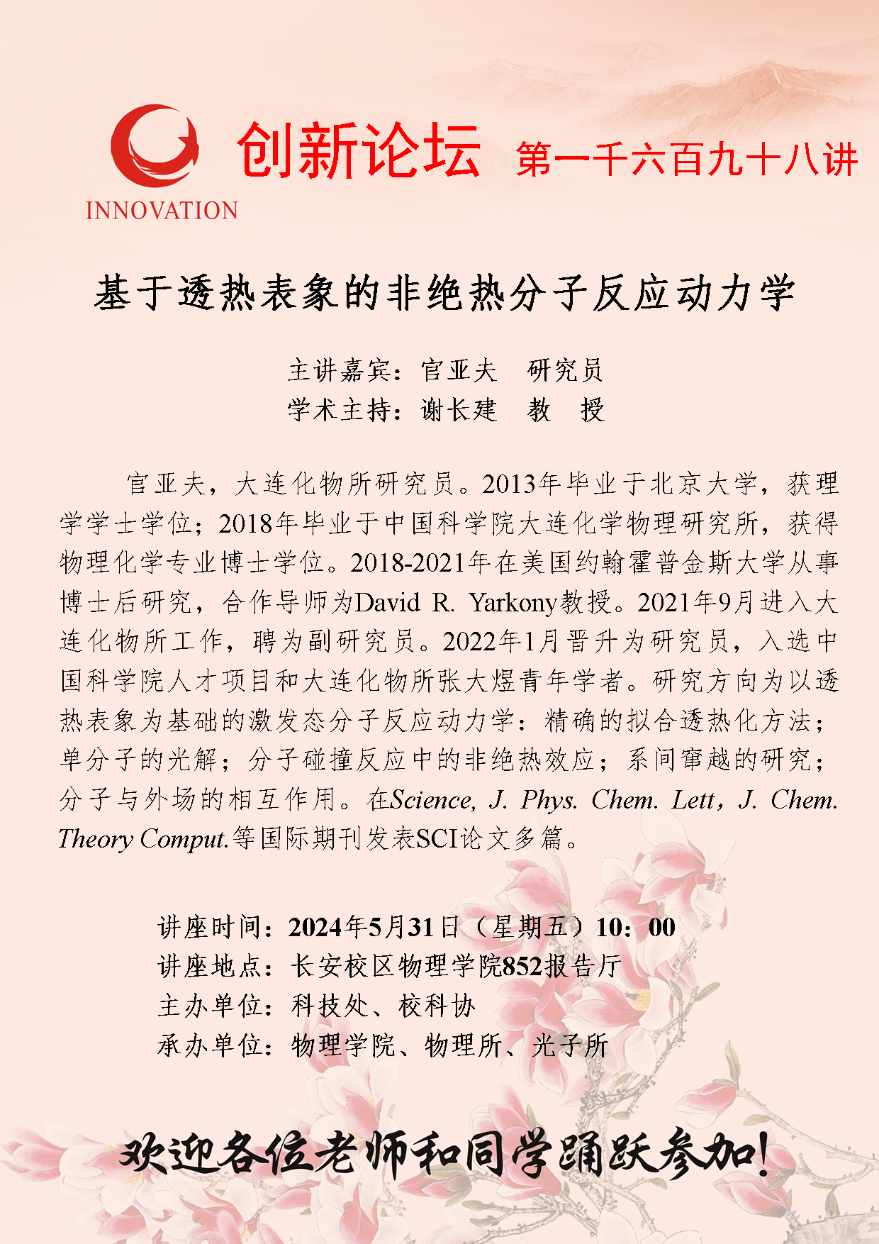 官亚夫 研究员 必赢3003no1线路检测中心创新论坛第一千六百九十八讲:基于透热表象的非绝热分子反应动力学 讲座时间 2024年5月31日(星期五)10:00 讲座地点 长安校区物理学院852报告厅 讲座人介绍 官亚夫 研究员 讲座内容