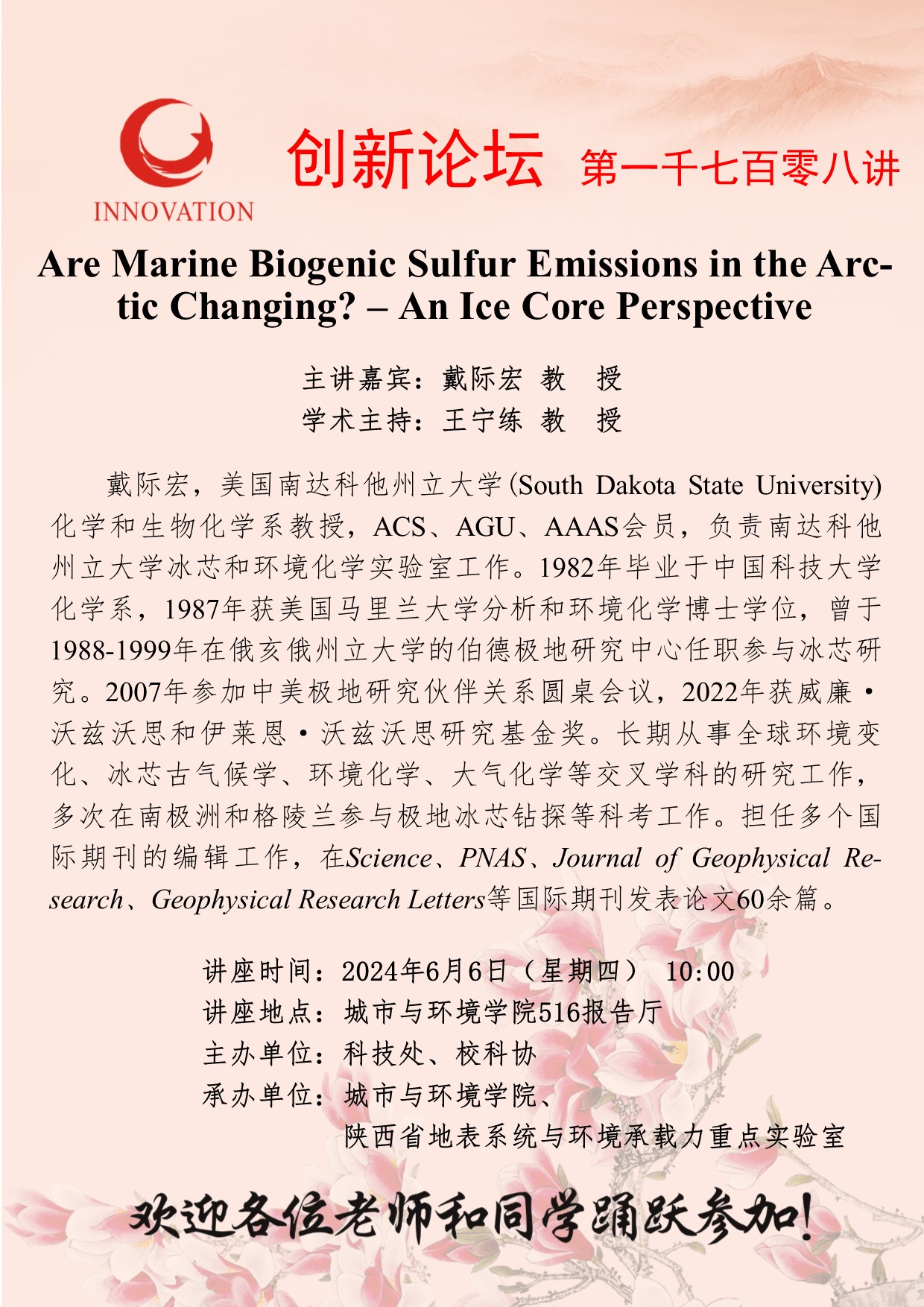 戴际宏 教授 必赢3003no1线路检测中心创新论坛第一千七百零八讲:Are Marine Biogenic Sulfur Emissions in the Arctic Changing? – An Ice Core Perspective 讲座时间 2024年6月6日(星期四) 10:00 讲座地点 城市与环境学院516报告厅 讲座人介绍 戴际宏 教授 讲座内容