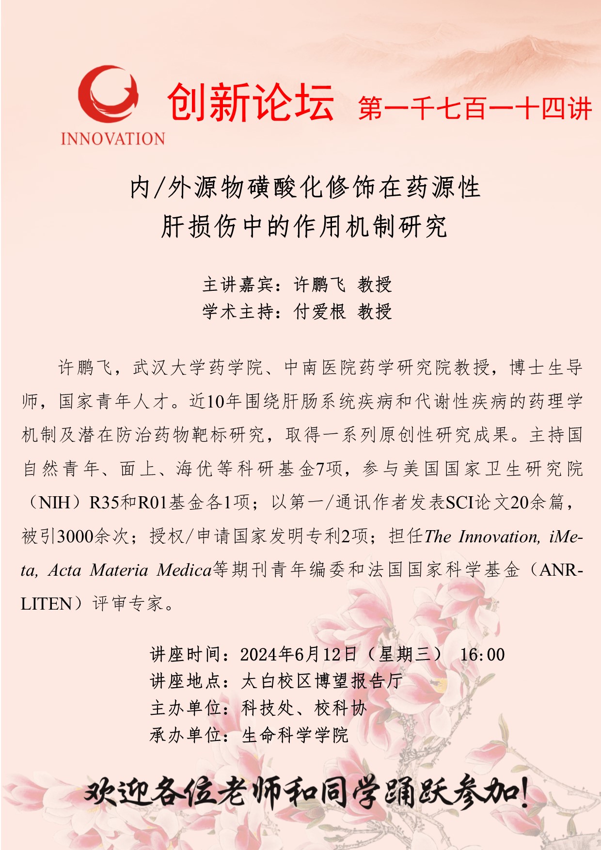 许鹏飞 教授 必赢3003no1线路检测中心创新论坛第一千七百一十四讲:内/外源物磺酸化修饰在药源性肝损伤中的作用机制研究 讲座时间 2024年6月12日(星期三) 16:00 讲座地点 太白校区博望报告厅 讲座人介绍 许鹏飞 教授 讲座内容