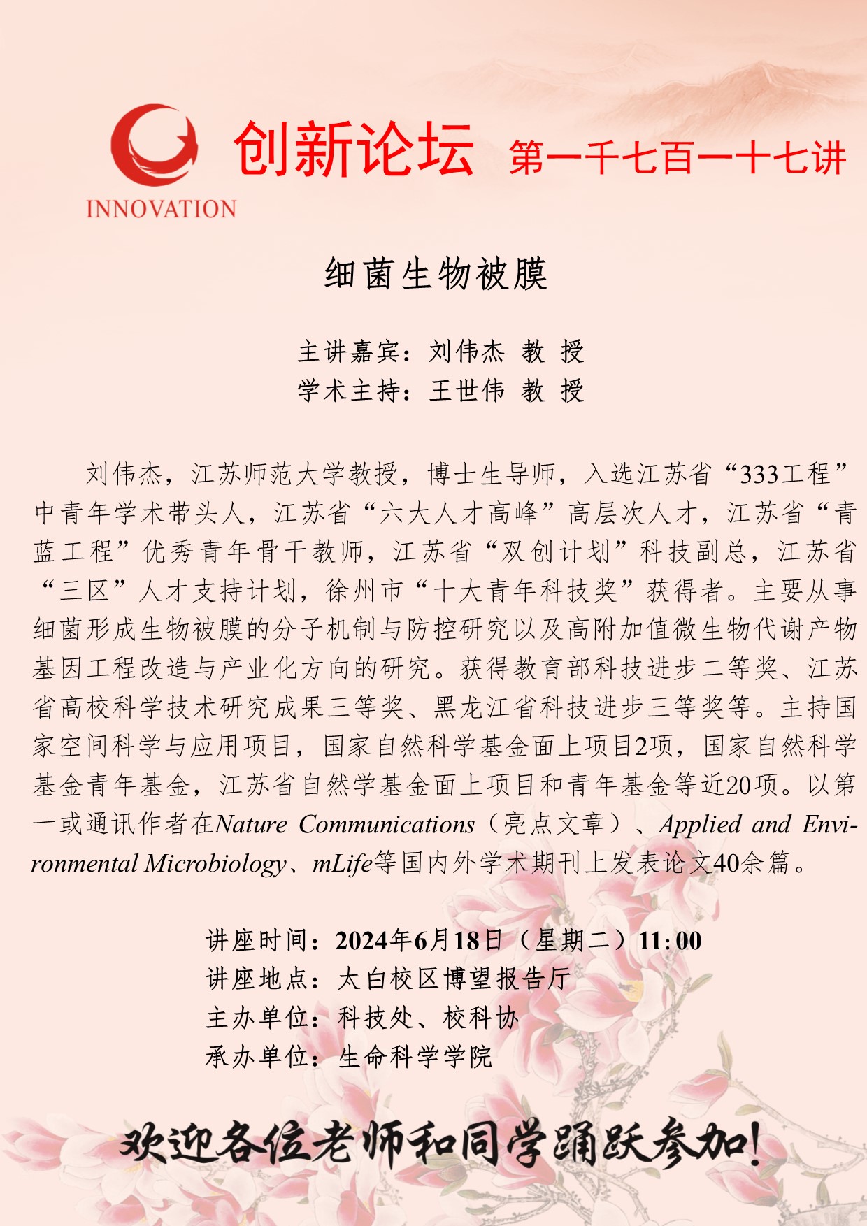 刘伟杰 教授 必赢3003no1线路检测中心创新论坛第一千七百一十七讲:细菌生物被膜 讲座时间 2024年6月18日(星期二)11:00 讲座地点 太白校区博望报告厅 讲座人介绍 刘伟杰 教授 讲座内容