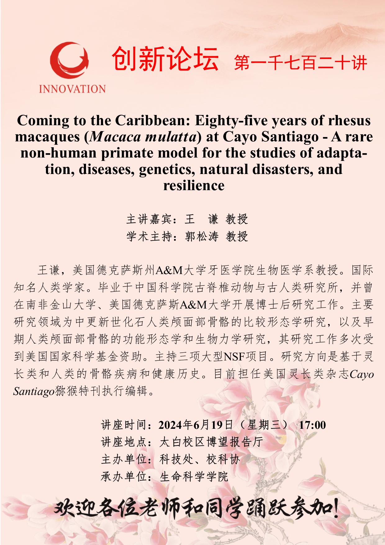 王谦 教授 必赢3003no1线路检测中心创新论坛第一千七百二十讲:Coming to the Caribbean: Eighty-five years of rhesus macaques (Macaca mulatta) at Cayo Santiago - A rare non-human primate model for the studies of adaptation, diseases, genetics, natural disasters, and resilience 讲座时间 2024年6月19日(星期三) 17:00 讲座地点 太白校区博望报告厅 讲座人介绍 王谦 教授 讲座内容
