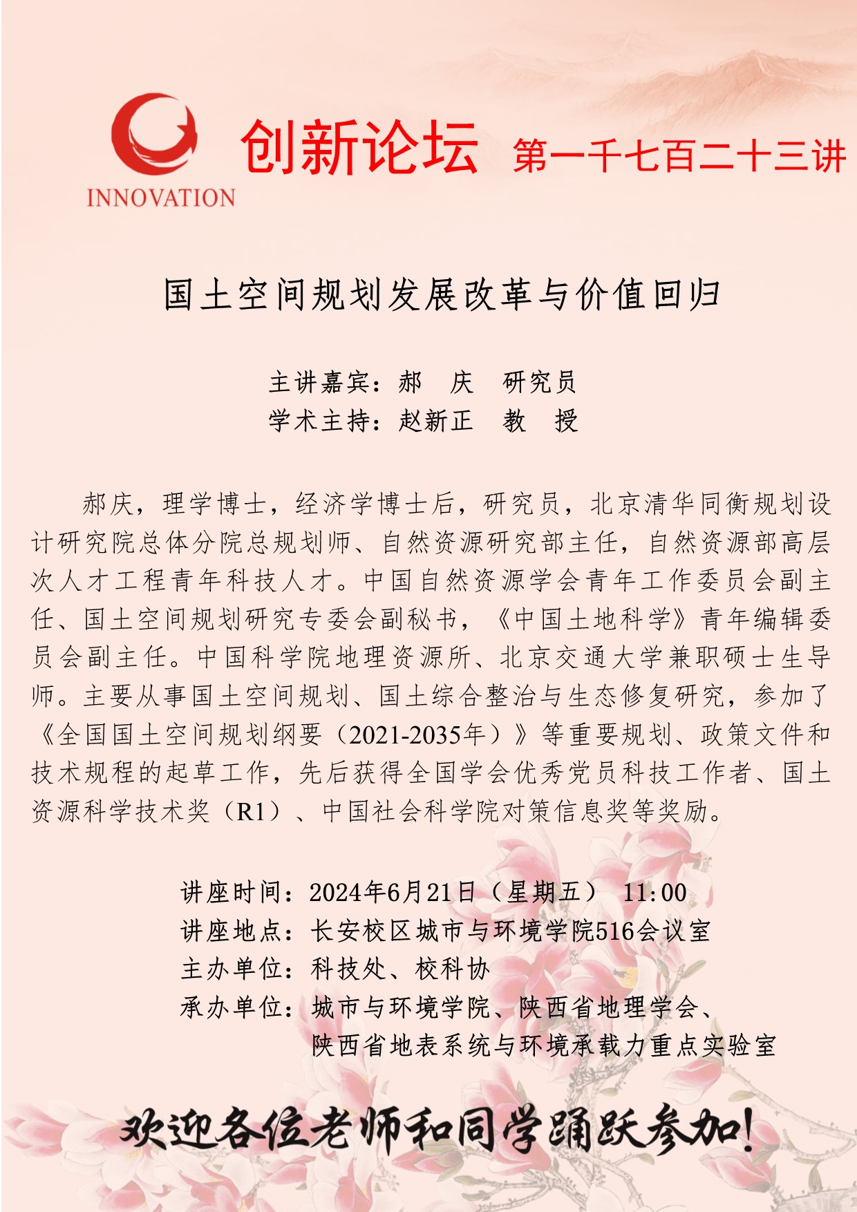 郝庆 研究员 必赢3003no1线路检测中心创新论坛第一千七百二十三讲:国土空间规划发展改革与价值回归 讲座时间 2024年6月21日(星期五) 11:00 讲座地点 长安校区城市与环境学院516会议室 讲座人介绍 郝庆 研究员 讲座内容