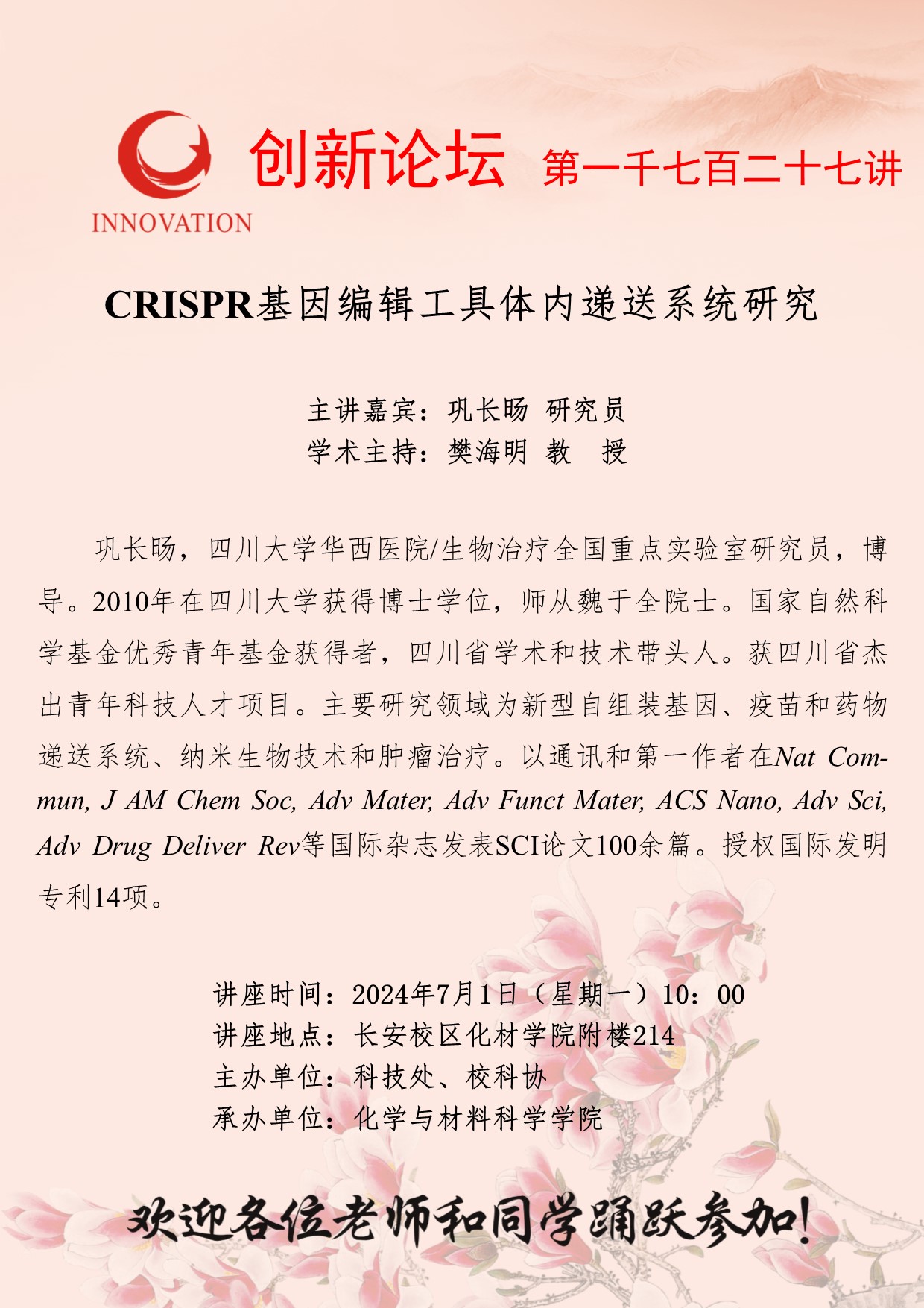 巩长旸 研究员 必赢3003no1线路检测中心创新论坛第一千七百二十七讲:CRISPR基因编辑工具体内递送系统研究 讲座时间 2024年7月1日(星期一)10:00 讲座地点 长安校区化材学院附楼214 讲座人介绍 巩长旸 研究员 讲座内容
