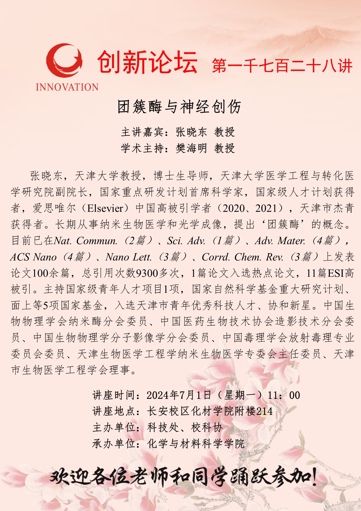 张晓东 教授 必赢3003no1线路检测中心创新论坛第一千七百二十八讲:团簇酶与神经创伤 讲座时间 2024年7月1日(星期一)11:00 讲座地点 长安校区化材学院附楼214 讲座人介绍 张晓东 教授 讲座内容